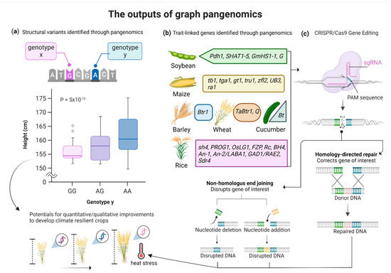 Schematic illustration of graph pangenomics outputs for crop improvements. (a) The analyzed datasets of graph pangenomes help identify structural variants among different genotypes that could be integrated after MAS into crops for trait improvements; (b) pangenomics identified trait-linked genes in different crops (adapted from [3]); (c) the identified gene targets could be used for fast-breeding using the CRISPR/Cas toolbox. This may bring desirable site-specific edits either through homology-directed repair or by introducing double-stranded breaks and subsequent cell DNA repair mechanisms, or by natural but the most time-consuming introgression breeding. Altogether, the identified traits or gene-edited plants may be developed to cope with ongoing climate change stress, such as temperature rises.