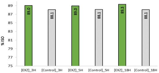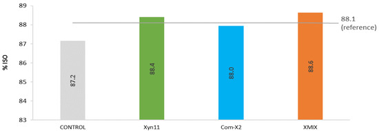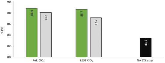 Taking into account the good pulp brightness level (89.0% ISO) obtained by 3 h treatment with Xyn11 (Figure 2), and given that Xyn11 stage has no detrimental effect on pulp properties, the possibility of saving ClO2 with a shorter enzymatic treatment (3 h instead of 5 h) was evaluated. This trial would enable us to define the best performance of EXZ stage combined with the use of bleaching conditions closest to the mill ones before pilot trial validation. Again, 15% less ClO2 was added at each D stage of the bleaching sequence (D0EpD1D2). Three hours of enzymatic treatment were enough to exceed (88.7% ISO) the brightness of the mill reference (88.1% ISO), even when 15% less ClO2 was used in the bleaching sequence, confirming the bleaching potential of Xyn11 (Figure 6). The trial also demonstrated the positive effect that the extreme conditions of temperature and pH applied have on pulp brightness, even without the addition of enzyme.