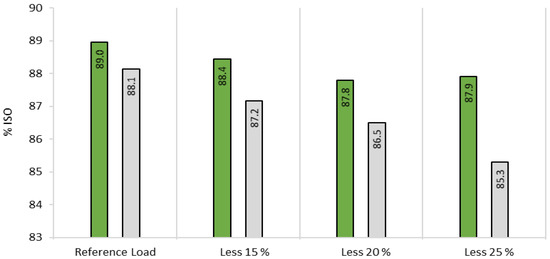 Final pulp brightness (after D2) obtained after 5 h prebleaching stage with Xyn11 (green) followed by bleaching with reference ClO2 load or with 15%, 20% or 25% less ClO2 in each D step, compared with the corresponding controls (grey).
