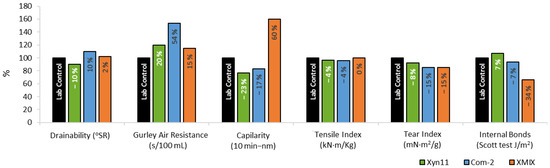 Figure 5 shows the papermaking properties of the enzymatically bleached pulps refined with 2000 revolutions (to obtain a drainage index close to the 30 °SR of the market bleached pulp) compared to that of control pulp (with no ClO2 savings and no enzyme addition). In general, pulp properties were not significantly affected by the enzymatic stages (most variations were within the instrumental error). However, Com-X2 and XMIX had more impact on the porosity of the fibre network. The internal bonding, tear index and tensile index were less effected by Xyn11 treatment.