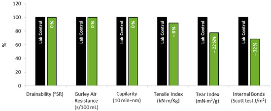 Papermaking properties obtained for the pulp bleached with the Xyn11-assited sequence with 15% ClO2 savings (green) in relation to the control (with no xylanase addition) at pilot scale.