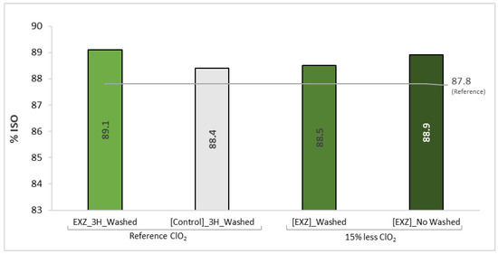 Final brightness of a mixed hardwood pulp obtained after bleaching with the EXZ-bleaching sequence. The reference brightness (87.8% ISO) refers to the pulp usually obtained at mill.
