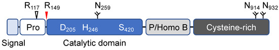 In human PCSK6, there are three predicted N-glycosylation sites at N259, N914, and N932, respectively (Figure 1). These sites are conserved in PCSK6 homologs among mammalian species, with dogs being an exception, which have only two predicted N-glycosylation sites (corresponding to N259 and N932 in humans, respectively). In trypsin-like serine proteases, N-glycosylation facilitates protein folding, intracellular trafficking, cell surface expression, or secretion [40,41,42,43]. N-glycan-mediated interactions with calnexin, an ER chaperon, are critical for protein folding and ER exiting [41,44]. To date, the significance of N-glycosylation in PCSK6 remains unclear. Additional studies are required to verify if those predicted sites are N-glycosylated and to understand the potential role of N-glycans in PCSK6 biosynthesis and function.