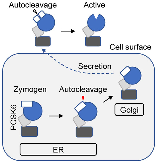 PCSK6 is synthesized in a one-chain zymogen form. After the signal peptide is removed by signal peptidase in the endoplasmic reticulum (ER), PCSK6 undergoes a two-step autoactivation process, which resembles those in furin and PC5A activation [31,32]. The first autocleavage at RVKR149↓ between the pro-domain and the catalytic domain occurs in the ER [33] (Figure 2). The cleaved pro-domain is attached to the remaining fragment, thereby blocking PCSK6 catalytic activity. Moreover, the cleaved pro-domain acts as an intramolecular chaperone in protein folding and subsequent ER exiting [34]. Upon reaching the cell surface, PCSK6 binds to membrane-associated heparan sulfate proteoglycans and undergoes another autocleavage at KR117↓ within the pro-domain (Figure 2) [32]. This second cleavage removes the pro-domain, converting PCSK6 to a fully active enzyme [32].