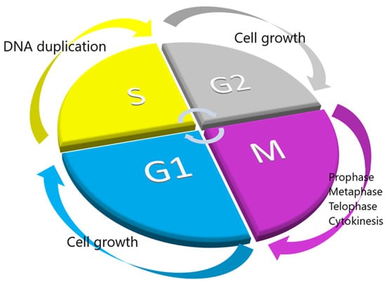 The life cycle of a cell, from the beginning of its existence till its division into two daughter cells, is most commonly called the cell cycle. The cell cycle includes a harmonized sequence of events that leads to two cells that share the same amount of DNA. To better understand and study the cell cycle, we divide it into different stages or phases, including the G1, S, G2, and M phases. The G1 earlier phase is the stage where a cell “decides” whether to divide or not. If not, it enters a state of low metabolic consumption, called G0, and if yes, it enters the latter phase of G1, where it prepares to duplicate its DNA [,]. The next stage is the S phase, known as synthesis, in which the cell copies the chromosomal DNA. The following stage is known as G2, where it prepares to divide. The next stage is the M stage, also known as mitosis and cytokinesis; in mitosis, the cell separates the two copies of nuclear DNA into two newly formed nuclei, and in cytokinesis, the cytoplasm is also divided to form the two daughter cells. As the M phase is completed and the cell division finishes, a new cell cycle starts over (Figure 1).