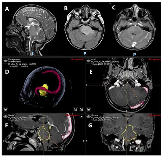 Diffuse intrinsic pontine glioma in a 5-year-old boy. (A) Sagittal MRI T2-WI demonstrating diffuse enlargement of the pons. (B) Axial T2-Flair image. (C) Axial T1-gad showing absence of contrast enhancement. (D–G) Frameless neuronavigation system planning for tumor biopsy and further molecular study of the tumor. (D) Brain lesion is observed in yellow and the transverse and sagittal sinuses in red. (E) Axial T1 contrast enhanced. Dotted line showing the planned biopsy trajectory. (F) Sagittal T1 contrast enhanced. View of the tumor demarcated in yellow and the tumor biopsy trajectory shown by dotted line. (G) Coronal T1 contrast enhanced. View of tumor biopsy trajectory and red dot as the target.