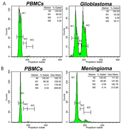 Alexiou GA et al. described the tumor index (TI) as an important parameter investigated through the DNA histogram that correlates with the proportion of cells in the S and G2/M phases and the degree of tumor malignancy [,,]. The TI is calculated as the cumulative percentage of cells in the S and G2/M phases, corresponding to the proliferating cancer cells. In addition, the quantification of an additional index, the DNA index (DI), may indicate the presence of aneuploidy, providing information on the ploidy of cancer and whether an abnormal number of chromosomes are present in cancer cells. The DI is used to assess the DNA ploidy of a tumor sample by comparing the DNA content of the G0/G1 cell population of presumed tumor cells with that of normal (control) cells. Toward this end, the peak value of the integrated fluorescence of the G0/G1 population of normal cells is considered to be DI = 1.0 (diploid cells). DNA ploidy of tumor cells is expressed as a ratio of the peak value of fluorescence intensity of these cells divided by that of the normal G0/G1 cells. Most frequently, normal lymphocytes/monocytes, including peripheral blood mononuclear cells (PBMCs) from the same patient, can be used as the external standard control of DI = 1.0.