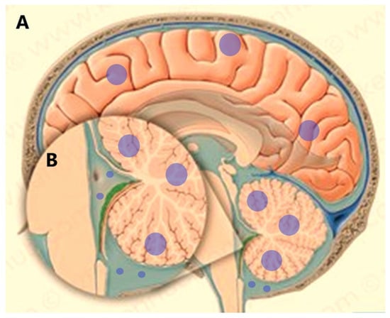 Leptomeningeal dissemination from brain tumors. (A). Brain lesions are shown with blue circles. (B). Tumor cell dissemination into the CSF space.