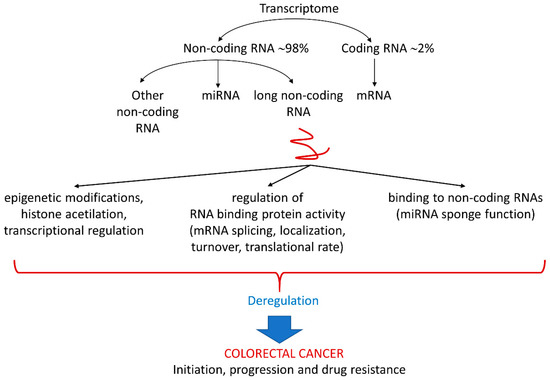 Along with somatic gene mutations and altered gene expression profiles, regulatory non-coding RNAs (ncRNAs) and other epigenomic determinants have been identified as potential biomarkers of CRC initiation, progression, prognosis, and drug treatment response [4].