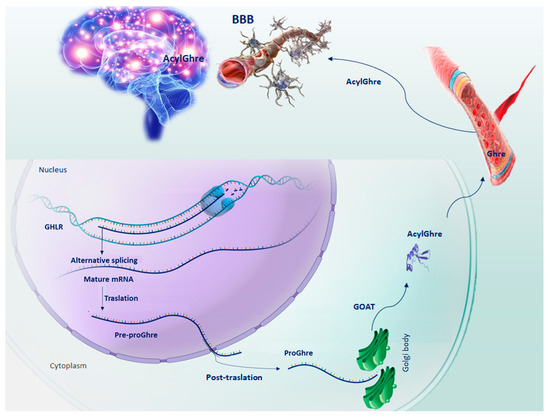 Schematic representation of the sequential steps of Ghrelin production. GHLR gene, located on the short arm of chromosome 3, through splicing alternative process, generates the mRNA from which the pre-proGhre precursor will originate. In turn, pre-proGhre is cleaved to pro-Ghre and transported to the Golgi body, where it is acylated by the action of the GOAT enzyme. The acylated form of Ghre through the circulatory system reaches and crosses the BBB, carrying out its functions in the brain. Abbreviation = AcylGhre, acylated Ghrelin; BBB, blood–brain barrier; Ghre, Ghrelin; GHLR, human ghrelin gene; GOAT, Ghre-O-acyltransferase; Pre-proGhre, pre-proGhrelin; ProGhre, pro-Ghrelin.