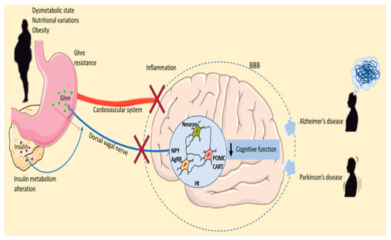 Ghrelin’s roles in malnutrition and neurodegenerative diseases. Dysmetabolic state, nutritional variations and obesity can lead to Ghre resistances and insulin metabolism alteration. Ghre is synthesized by the stomach and released into the peripheral blood. Moreover, Ghre reaches the brain both by crossing the and by the dorsal vagal nerve. In the Ht, Ghre stimulates the release of orexigenic neuropeptide stimulating appetite. Obesity alters insulin metabolism. In the fasting conditions, AgRP expression increases, whereas POMC expression is reduced. During the fed state, the level of AgRP is reduced, and POMC levels increase, stimulating energy expenditure and altering the metabolic feedback loop. Inflammation of the hypothalamus due to malnutrition and dysmetabolism can lead to cognitive function impairment promoting neurodegenerative disease development. Abbreviation = AgRP, agouti-related peptide; BBB; blood–brain barrier CART, cocaine- and amphetamine-regulated transcript; Ghre, Ghrelin; Ht, hypothalamus; NPY, neuropeptide Y; POMC, proopiomelanocortin; The figure was produced using Servier Medical Art.