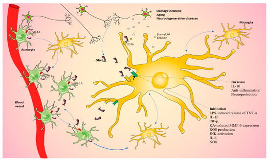 Both Ghre and microglia are involved in the pathophysiology of neurodegenerative diseases characterized by neuronal damage such as Alzheimer’s disease (AD) and Parkinson’s disease (PD) [5,6].