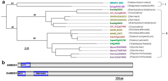 To gain a better understanding of MOS1 proteins in plants using information from Arabidopsis MOS1 (At4g24680), we selected a total of 12 plant species for MOS1 gene identification based on their evolutionary distance and availability of full-genome sequences. The genome databases of these organisms were searched with BLASTP (2 March 2019, NCBI, https://www.ncbi.nlm.nih.gov/) using the Arabidopsis AtMOS1 protein sequence. The full-length protein sequences of 17 candidate MOS1 proteins were identified from 12 plant species. There were one or two MOS1 proteins in each of the 12 selected plant species. A phylogenetic tree was constructed using the full-length protein sequences of the 17 candidate MOS1 proteins. Phylogenetic analysis revealed that 12 plant species had two clades of MOS1 (Figure 1a). The rice protein (accession numbers LOC_Os12g37860) was identified as a MOS1 protein in rice by confirming that it contained the conserved BAT2 domain (Figure 1b). We then named this gene OsMOS1. Sequence analyses revealed that OsMOS1 encodes a protein consisting of 1460 amino acids (Supplemental Figure S1). The deduced amino sequence of OsMOS1 shared 60% similarity with AtMOS1 (Supplemental Figure S1). The protein domain analyzed by the SMART website tool (8 March 2019, http://smart.embl-heidelberg.de/) showed that OsMOS1 contained a conserved BAT2 domain at the N-terminal region. In addition to the BAT2 domain, OsMOS1 also contained a PRK10263 (DNA Translocase FtsK) domain, which was different from other MOS1 proteins, including AtMOS1 in plants (Figure 1b).