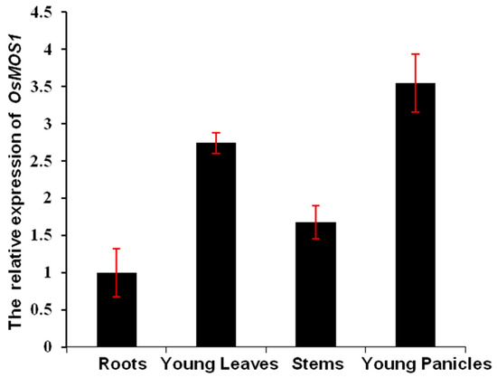 To gain insights into the possible functions of the OsMOS1 gene in rice, the expression patterns of the OsMOS1 gene in different rice tissues were examined by quantitative reverse transcription PCR (qPCR). The qPCR results revealed that the OsMOS1 gene was expressed over a wide range of tissues in the wild-type rice cultivar Nipponbare (NIP) (Figure 2). OsMOS1 transcripts were detectable in all of the selected organs, including the root (three-leaf stage), stem (three-leaf stage), leaf (three-leaf stage), and panicle (young panicles at P2 stages) of the wild-type rice cultivar NIP and with the highest transcript levels in the young panicles (Figure 2). The expression patterns of the AtMOS1 gene were also examined by taking advantage of the online, publicly available microarray data. The tissue expression patterns analyses using the BAR website (15 October 2022, http://www.bar.utoronto.ca/) revealed that the AtMOS1 gene was also expressed over a wide range of tissues in the wild-type Col-0 (Supplemental Figure S2). AtMOS1 transcripts were detectable in all of the selected organs, including the roots (four-rosette leaf stage), stems (four-rosette leaf stage, second internode), leaves (rosette leaf 2), and siliques (stage 8 siliques), with the highest transcript levels in the siliques (Supplemental Figure S2). These results reveal that OsMOS1 and AtMOS1 had similar tissue expression patterns, suggesting the functional conservation of MOS1 in rice and Arabidopsis.