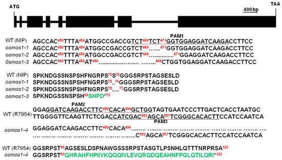 For the functional characterization of OsMOS1, we generated its loss of function mutants in the NIP or R7954 (O. sativa L. ssp. indica) background using CRISPR/Cas9 gene-editing technology [33]. Homozygous mutants were identified in the T0 generation by sequencing the PCR product containing the CRISPR/Cas9 target sites. Four OsMOS1 mutants (osmos1-1, osmos1-2, osmos1-3, and osmos1-4) were obtained, and all but osmos1-1 and osmos1-2 were predicted to be loss-of-function (LOF) mutants (Figure 3). The osmos1-1 mutant contained a three-base-pair (bp) deletion at the position of 468–470 (relative to the translation initiation site), leading to a 1-amino acid deletion (amino acid 75) in its predicted coding protein. The osmos1-2 mutant contained a 6 bp deletion at the position of 468–473, leading to a 2-amino acid deletion (amino acids 75–76) in its predicted coding protein. The osmos1-3 mutant contained a 13 bp deletion at the position of 457–469, leading to reading frame shifts in OsMOS1 and a stop codon at amino acid 73. The osmos1-4 mutant was generated by targeting sequences different from those of osmos1-1, osmos1-2, and osmos1-3, so they were independent from osmos1-1, osmos1-2, and osmos1-3 and unlikely to have had the same off-target mutations, if any. The osmos1-4 mutant contained a 58 bp deletion at positions 495–552, leading to reading frame shifts in OsMOS1 and a stop codon at amino acid 123.