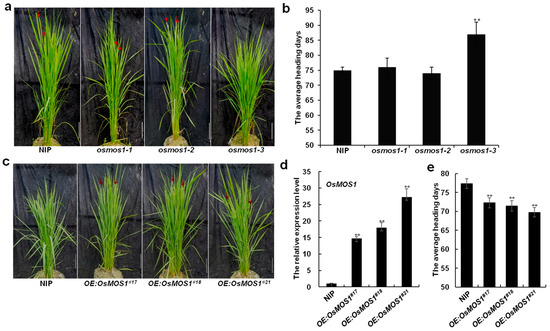 To further evaluate the function of OsMOS1 in the heading date, an OsMOS1 overexpression vector was constructed and transformed into NIP. After the confirmation of the presence of the transgene by the PCR, we obtained 21 transgenic plants. The transcript levels of OsMOS1 were significantly increased in the overexpressing transgenic lines, and three representative OsMOS1-overexpressing transgenic lines, i.e., #17, #18, and #21, were used for further analyses (Figure 4d). Compared with the WT, the OsMOS1-overexpressing plants headed approximately 7 d earlier under NLD conditions (Figure 4c,e).