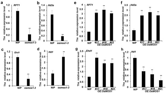 Expressions of the floral regulator genes in Nip, osmos1-3, and OsMOS1-overexpressing lines under LD conditions. (a–d) Expressions of the RFT1 (a), Hd3a (b), Ehd1 (c), and Hd1 (d) in Nip and osmos1-3 under LD conditions. (e–h) Expressions of RFT1 (e), Hd3a (f), Ehd1 (g), and Hd1 (h) in NIP and OsMOS1-overexpressing lines under LD conditions. The fully emerged leaf blades from Nip, osmos1-3, and OsMOS1-overexpressing plants under LD growth conditions were sampled at 45 days after germination. The expression of Hd1 was observed at ZT 14 h and other floral regulator genes were monitored at ZT 2 h. The rice ACTIN gene was used as the internal control. Error bars indicate the standard deviation, n = 3. Asterisks indicate a significant difference between NIP and osmos1-3 (** p < 0.01, Student’s t-test).