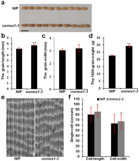 Analyses of the grain and cell sizes of NIP and the osmos1-3 mutant. (a) Grain morphology of NIP and the osmos1-3 mutant. Scale bars correspond to 1 cm. (b,c) Statistical analyses of the grain length (b) and grain width (c) between NIP and the osmos1-3 mutant. Error bars indicate the standard deviation, n = 3 × 50. Asterisks indicate a significant difference compared with NIP (** p < 0.05, Student’s t test). (d) Statistical analysis of the 1000-grain weight between NIP and the osmos1-3 mutant. Error bars indicate the standard deviation, n = 3 × 500. Asterisks indicate a significant difference compared with NIP (** p < 0.01, Student’s t test). (e) Electron microscopy scan of the outer glume surface of a mature grain from NIP and osmos1-3 mutants. Scale bars correspond to 65 μm. (f) Quantification of a single cell’s length and width per mm2 in (d). Asterisks indicate a significant difference compared with NIP (* p < 0.05, Student’s t test).