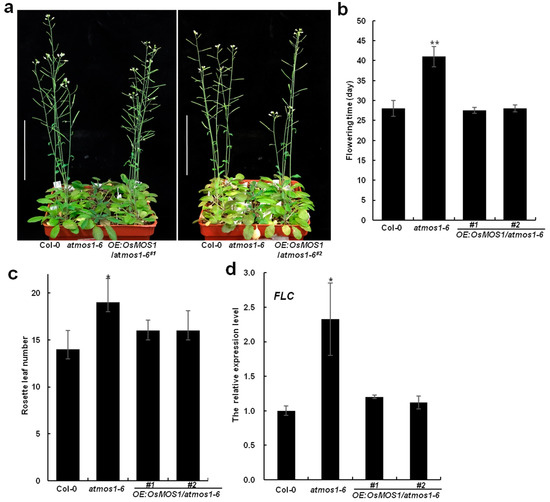 Analyses of flowering time and FLC gene expression in OsMOS1-overexpressing transgenic plants in Arabidopsis. (a) Flowering phenotypes of Col-0, atmos1-6, OE:OsMOS1/atmos1-6 #1, and OE:OsMOS1/atmos1-6 #2 plants under LD conditions. Scale bars = 5 cm. (b) Statistical analysis for flowering time of Col-0, atmos1-6, OE:OsMOS1/atmos1-6 #1, and OE:OsMOS1/atmos1-6 #2 plants under LD conditions. Asterisks indicate a significant difference compared with Col-0 (** p < 0.01, Student’s t-test). Error bars indicate the standard deviation, n = 15. (c) Statistical analysis for the rosette leaf numbers at the bolting stage of Col-0, atmos1-6, OE:OsMOS1/atmos1-6 #1, and OE:OsMOS1/atmos1-6 #2 plants under LD conditions. Asterisks indicate a significant difference compared with Col-0 (* p < 0.05, Student’s t test). Error bars indicate the standard deviation, n = 15. (d) Expression of the FLC in Col-0, atmos1-6, OE:OsMOS1/atmos1-6 #1, and OE:OsMOS1/atmos1-6 #2 plants under LD conditions. The Arabidopsis UFP gene was used as the internal control. Error bars indicate the standard deviation, n = 3. Asterisks indicate a significant difference compared with Col-0 (* p < 0.05, Student’s t test).