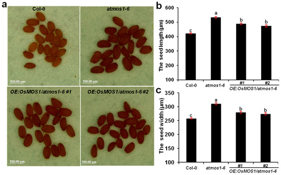 Analyses of seed size in Col-0, atmos1-6, and OE:OsMOS1/atmos1-6 transgenic plants. (a) Seed morphology of Col-0, atmos1-6, and OE:OsMOS1/atmos1-6 transgenic plants. Scale bars correspond to 500 μm. (b,c) Statistical analysis of seed length (b) and seed width (c) in Col-0, atmos1-6, and OE:OsMOS1/atmos1-6 transgenic plants. Error bars indicate the standard deviation, n = 3 × 500. Different letters indicate significant differences based on Duncan’s multiple range test among the means via ANOVA (p < 0.05). The cell length and width were determined by averaging the results for three replicates (each replicate consisted of at least 30 cells).