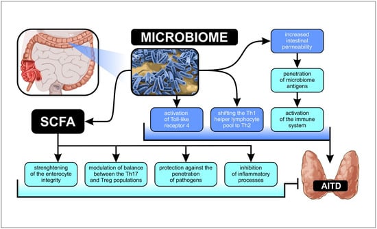 Studies have reported the association between dysbiosis and the onset of diseases such as type 1 diabetes, rheumatoid arthritis, inflammatory bowel disease, systemic lupus erythematosus, autoimmune dermatitis, and autoimmune neurological diseases [12]. In these diseases, interactions in the pathomechanism can be observed at the level of microbes and their metabolites. Several pathomechanisms focusing on AITDs are available in the literature. Firstly, alterations in the composition of intestinal bacteria can lead to increased intestinal permeability [13], which is associated with an increased level of zonulin, a protein responsible for the regulation of intercellular connection [14,15]. The decreased tightness of enterocytes enables the penetration of microbiome antigens and the activation of the immune system via molecular mimicry [16]. Some bacterial antigens in the intestine have structures similar to those of autoantigens. Due to this analogy, plasma cells may be activated to generate antibodies that bind to antigens expressed on thyroid follicle cells and orbital fibroblasts in GO [17]. Dysbiosis also results in an increased production of autoantibodies by posttranslational protein modification. Furthermore, it contributes to the development of AITDs by shifting the Th1 helper lymphocyte pool to Th2 and inducing Toll-like receptor 4’s activation [18,19].