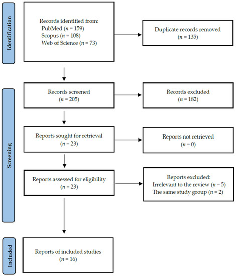 The results were filtered by the publication date (i.e., studies published after 2000). The title, abstract, and full text of the results were screened by two independent investigators. Studies included in this review matched all the predefined criteria according to PICOS (“Population”, “Intervention”, “Comparison”, “Outcomes”, and “Study design”), as shown in Table 6. A detailed search flowchart is presented in the Section 2. The study protocol was registered in the international prospective register of systematic reviews PROSPERO (CRD42022335984).