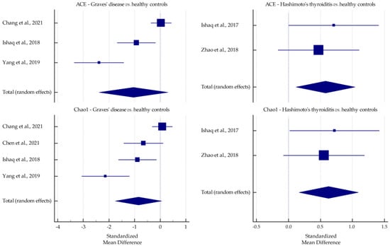 Pooled standardized mean differences in ACE and Chao1, shown separately for Graves’ disease and Hashimoto’s thyroiditis [30,31,32,39,43,45].