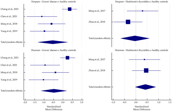 Pooled standardized mean differences in Simpson and Shannon indices, shown separately for Graves’ disease and Hashimoto’s thyroiditis [30,31,32,39,43,45].