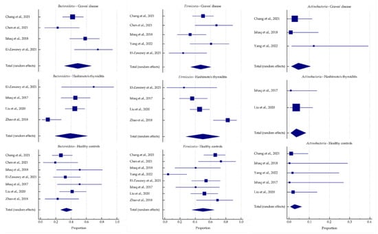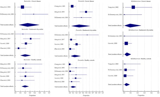The pooled relative abundance calculated for the most common phyla and genera from the included studies is represented in Figure 5 and Figure 6, respectively, and their values are presented in Table 4. In GD patients, a trend toward an increased abundance of Bacteroidetes and Actinobacteria was observed at the phylum level. This was reflected in a higher abundance of Prevotella and Bifidobacterium at the genus level. In summary, HT patients showed an abundance of the selected microbiota similar to those of healthy subjects.
