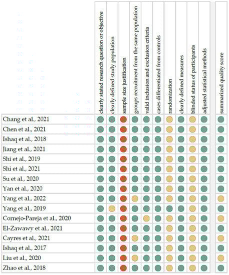 The risk of bias in each of the selected studies was assessed using the “Study Quality Assessment Tool” issued by the National Heart, Lung, and Blood Institute within the National Institute of Health [87]. This questionnaire was answered by the two independent investigators, and any disagreements were resolved by discussion between them. The summarized quality assessment for the individual studies is represented in Figure 7. Critical appraisal was summarized by adding the points for each criterion of potential risk (points: 1—low, 0.5—unspecified, 0—high). Twelve studies (75.0%) were classified as having “good” quality (≥80% total score) and four (25.0%) as having “intermediate” quality (≥60% total score). The level of evidence was evaluated using the classification of the Oxford Centre for Evidence-Based Medicine levels for diagnosis [88]. All of the included studies showed the third or fourth level of evidence (in this 5-grade scale).
