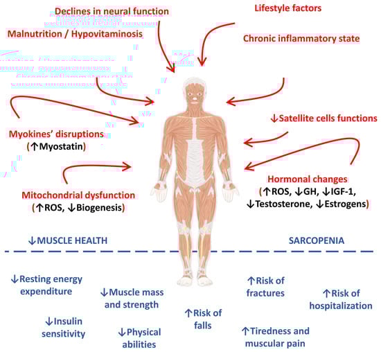 Sarcopenia is the condition in which the muscles present a reduced number of myofibers and hypotrophic myofibers (mainly type II myofibers), infiltration with adipose tissue, and, in later stages, fibrotic and a decrease in the number of satellite cells (SCs). The etiology of the onset of sarcopenia is multifactorial, involving neurological factors related to the loss of motor neurons, endocrine changes due to reduction or loss of hormone expression, such as testosterone or growth hormone (GH), loss of muscle motor units, and also by nutritional and lifestyle changes closely linked to adherence to sedentary habits [,,].