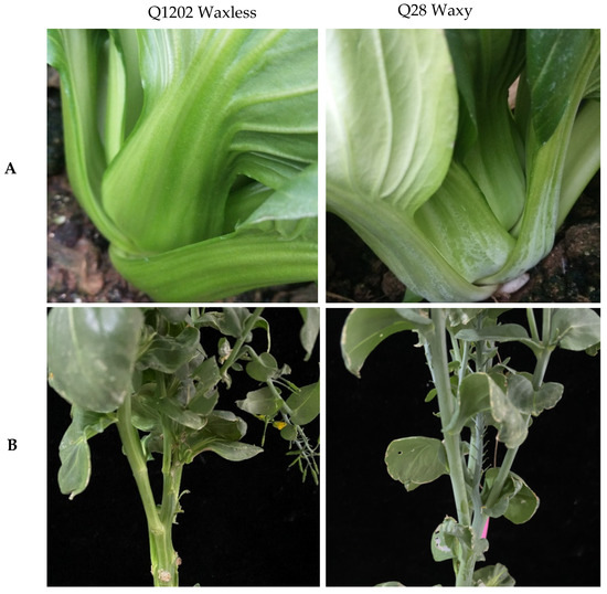 SEM was used to study the leaf surfaces of Q1202 and Q28 plants. Petioles or stems of waxy nonheading Chinese cabbage were analyzed during rosette and bolting stages, and each sample of leaves was cut into small pieces (approximately 5 mm2) with a razor blade. The leaf pieces were then adhered to the sample table with conductive double-sided adhesive and placed under a vacuum pump. The air was extracted, and the phenotype was analyzed under an SEM (TM3030 PLUS, HITACHI, Tokyo, Japan).