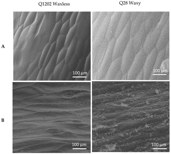Scanning electron micrographs of Q1202 and Q28 at the rosette (A) and shoot stages (B).