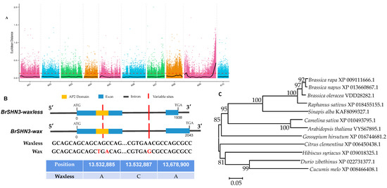 Distribution of ED on chromosomes between interpools (A), analysis of waxy candidate gene mutation sites (B), and phylogenetic tree of BrSHINE3 of each species (C).