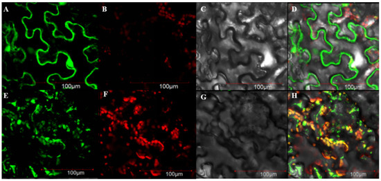 BrSHN3 was predicted to be localized in the chloroplasts and nucleus. Tobacco leaves were observed 48 h after injection under a confocal microscope (Figure 4). 35S-GFP was detected in the fluorescence field, and the superimposed field showed a green fluorescence signal in the nucleus and cell membrane. 35S:BrSHINE3-GFP was detected in the fluorescence field and superimposed field, and the green fluorescence signal was found in the nucleus of the superimposed field. In the superimposed field, the green fluorescence signal appeared in the nucleus of brown algae. The overlapping positions of green and red fluorescence signals in the superimposed field were concentrated in chloroplasts (Figure 4E–G), and the results were consistent with the predicted results. These results indicate that the 5′-terminus of the protein functions as a transport peptide, and the protein encoded by this gene is localized to chloroplasts. Thus, BrSHINE3 is localized in the nucleus and chloroplast, and we speculate that this gene may function as a transcription factor.
