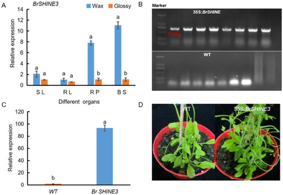 The expression profile of candidate gene BrSHINE3 was analyzed (A), molecular verification of transgenic Arabidopsis (B), expression level analysis of transgenic Arabidopsis (C) and phenotype analysis of transgenic plants (D). Different lowercase letters in the same column indicate significant differences at the 0.05 level among treatments.