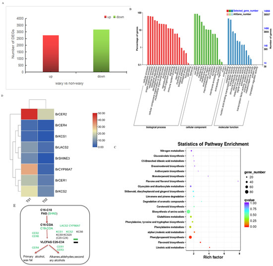 Transcriptome and differential gene pathway analysis.Number of DEGs (A), KEGG classification (B), KEGG enrichment map (C), Analysis of differential gene expression changes (D), Wax metabolic pathway (E).