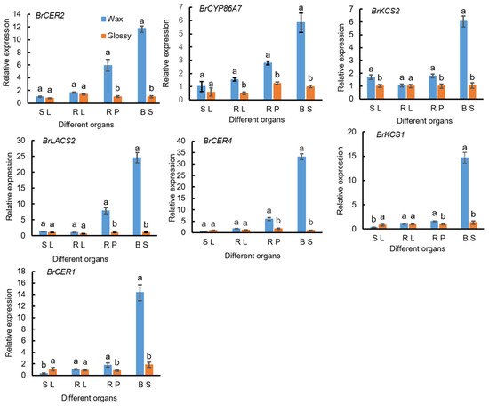 The expression levels of seven DEGs, BrCER2, BrCYP86A7, BrKCS2, BrLACS2, BrCER4, BrKCS1, and BrCER1, were detected using qPCR in different parts of waxy and waxless plants and plants under high-temperature stress. Significant differences in the expression levels of DEGs were observed in different tissues of waxy plants, among which higher expression was detected in the petioles at the rosette stage and the flowering stems at the bolting stage. The expression levels of these seven genes were relatively low in waxless phenotype plants (Figure 7). After exposure to high-temperature stress for 3 and 6 d, the seven DEGs showed higher expression in waxy phenotype materials than in waxless phenotype materials, and the differences were significant. With the prolongation of high-temperature stress, the expression of the eight genes showed dynamic changes, first increasing and then decreasing. Among these genes, the expression levels of BrKCS2, BrLACS2, and BrCER1 in waxy plants reached a maximum after 3 d of high-temperature stress, and the expression levels of BrCER2, BrCYP86A7, BrCER4, and BrKCS1 reached a maximum after 6 d of high-temperature stress (Figure 8); therefore, the expression of key genes involved in wax synthesis in nonheading Chinese cabbage exhibits spatial and temporal differences and is regulated by temperature.