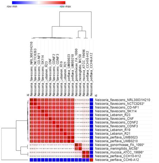 Functional heatmap of Neisseria flavescens and Neisseria perflava OrthoANI values. Reference genomes are marked by asterisk. Generation of the heatmap was done using Morpheus software (https://software.broadinstitute.org/morpheus/ (accessed on 2 November 2022)).