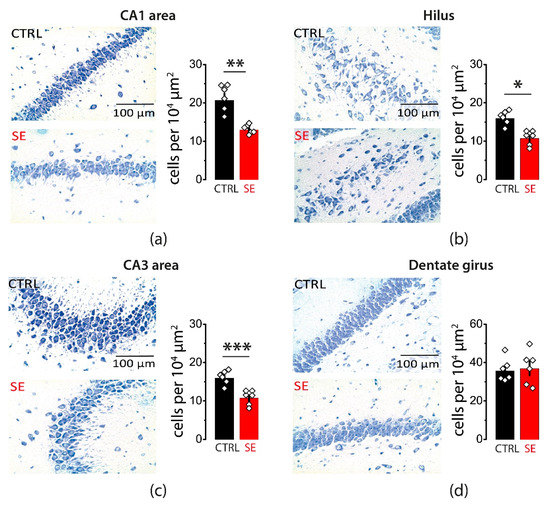Whether a single episode of early-onset seizures causes neurodegeneration remains controversial. Therefore, we evaluated potential neuronal loss in various areas of the hippocampus one month after PTZ-induced seizures. Nissl staining confirmed cell loss in pyramidal layers of three hippocampal regions: CA1, CA3, and the hilus (CA1: 20.6 ± 1.7 cells per 104 μm2 in control, n = 6; 12.9 ± 0.5 cells per 104 μm2 after SE, n = 6; t-test = 4.4, p < 0.01; CA3: 26 ± 3 cells per 104 μm2 in control, n = 6; 16.8 ± 1.3 cells per 104 μm2 after SE, n = 6; t-test = 2.7, p = 0.02; Hilus: 15.9 ± 0.7 cells per 104 μm2 in control, n = 6; 10.7 ± 0.7 cells per 104 μm2 after SE, n = 6, t-test = 5.0, p < 0.001; Figure 1a–c). No significant changes in the cell density were observed in the granular cell layer of the dentate gyrus (35.6 ± 2.4 cells per 104 μm2 in control, n = 6; 36.8 ± 3.5 cells per 104 μm2 after SE, n = 6; t-test = 0.3, p = 0.77; Figure 1d).