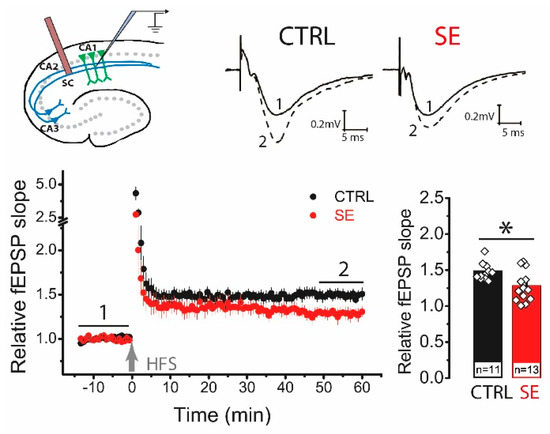 LTP is attenuated in the CA1 hippocampal area 30 days after PTZ-induced seizures. The schema above shows the positions of electrodes in the hippocampus. At the right are representative examples of field postsynaptic potential (fPSP) before (1) and 60 min after (2) HFS in control (CTRL) and post-SE (SE) groups. The diagram below shows the normalized slope of fPSP in control and post-SE groups before and after HFS. The bar graph illustrates the differences in LTP value between groups. All data are presented as a mean ± SEM. Each rhombus represents a value obtained in an individual animal. Student’s t-test: * p < 0.05.