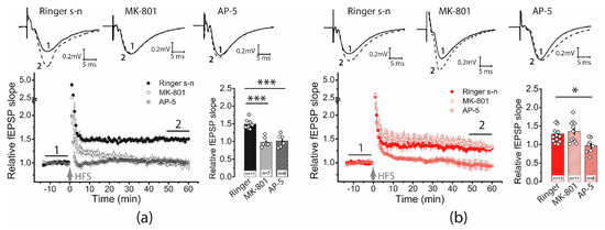 It has been shown that GluN2A-containing NMDARs are predominantly located in the PSD core and play a major role in the induction of LTP [31,32,33], while GluN2B-containing NMDARs are also located in extrasynaptic regions and regulate LTD or reduce the magnitude of LTP [34,35]. Our previous studies have shown that GluN2B-containing NMDA receptor expression may change during the first week after PTZ-induced seizures [36]. Thus, we can assume that the number of peri- and extrasynaptic GluN2B-containing NMDA receptors increase in the hippocampal synapses, and this, in turn, may cause LTP attenuation. Therefore, we decided to evaluate whether the level of expression of GluN2A and GluN2B subunits changes, as well as how the application of the GluN2B selective antagonist ifenprodil (3 μM) affects LTP induction.