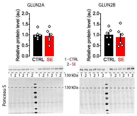 Representative Western blots images of NMDA receptor subunits GluN2A and GluN2B from the dorsal hippocampus of control (CTRL) and experimental (SE) groups. Bar graphs: data presented as mean ± SEM, which were normalized to total protein. t-test, p > 0.05. Each rhombus represents a value obtained in an individual animal. Images: the upper part shows the chemiluminescent signal, and the lower part shows the Ponceau S.