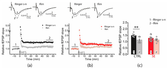 To determine whether the locus of synaptic plasticity induction changed, we compared the paired ratio of field postsynaptic potential (fPSP) amplitudes before and after the application of the HFS protocol. In control animals, the ratio of amplitudes did not change after HFS (baseline: 1.42 ± 0.04; LTP: 1.38 ± 0.06, n = 11; paired t-test = 1.06, p = 0.32). In the post-SE group, no changes in the amplitude ratio were observed either (BL: 1.32 ± 0.04; LTP: 1.32 ± 0.03; n = 14; paired t-test, t = 0.01, p = 0.99). No changes in the paired amplitude ratio indicate a postsynaptic locus of plasticity induction in both groups [24,25].