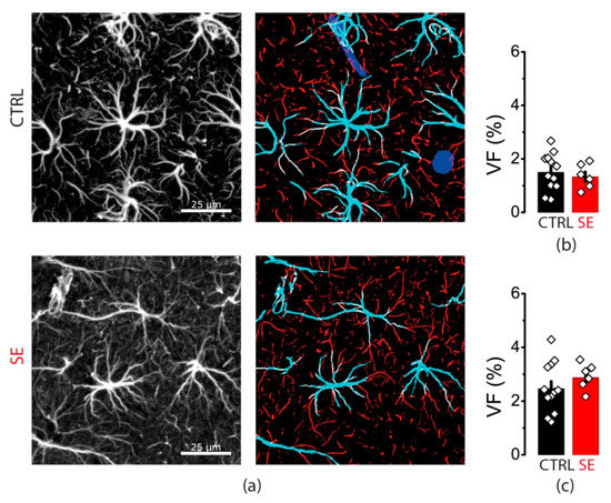 - Plata, A.; Lebedeva, A.; Denisov, P.; Nosova, O.; Postnikova, T.Y.; Pimashkin, A.; Brazhe, A.; Zaitsev, A.V.; Rusakov, D.A.; Semyanov, A. Astrocytic Atrophy Following Status Epilepticus Parallels Reduced Ca2+ Activity and Impaired Synaptic Plasticity in the Rat Hippocampus. Front. Mol. Neurosci. 2018, 11, 215. [Google Scholar] [CrossRef]
