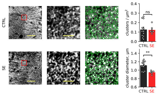 EAAT2 immunostaining. Representative examples of EAAT2 immunostaining from the dorsal hippocampus of control (CTRL) and experimental (SE) groups. Left: maximal projection of EAAT2-stained stack. Scale bar = 25 µm. Middle: Expanded part of the image boxed in the left image. The expansion shows the structural organization of EAAT2, which forms clusters. Scale bar = 5 µm. Right: detection of EAAT2 clusters. Bar graphs show relative EAAT2 cluster density and the mean cluster diameter. Data presented as mean ± SEM. Each rhombus represents a value obtained in an individual animal. t-test, ** p < 0.01.