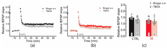 We applied TFB-TBOA (70 μM), which blocks mainly astrocyte transporters EAAT1 and EAAT2 [49]. However, a two-way ANOVA showed no significant effect of transporter blockade on plasticity (F(TBOA)1,38 = 3.14, p = 0.08) or differences in blocker action between the two groups (F(TBOA × seizure)1,38 = 0.47, p = 0.49, Figure 10).