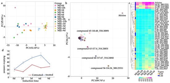 The production of Das is a major metabolic response of A. gymnandrum sterile seedlings to induction. MJ and MJL refer to the sample of root and aerial portions. (a) Principal component analysis of A. gymnandrum of different plant portions shows compounds with peak accumulation occurring at the indicated time, demonstrating that MJ has a greater impact on the root than aerial portions. (b) Principal component analysis of 77 metabolites in the root; the five compounds most representative of the first principal component are atisine, compound 45, compound 56, compound 63, and compound 66. (c) Cluster analysis of 40 metabolites in the root from A. gymnandrum at different induction times. The value of each compound was taken from relative content Log2 standardization. (d) Plots to demonstrate the increasing accumulation of the atisine in the root (error bars represent the standard error). Untreated and treated refer to the control group and experimental group, respectively.