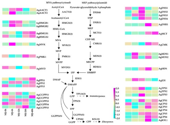 The expression profile for the genes involved in terpenoid biosynthesis in the root of A. gymnandrum. The transcriptome expression of each identified gene is Log2 normalization of fpkm values. Abbreviations: AACT, aceto-acetyl-CoA thiolase; CMK, 4-(cytidine 50-diphospho)-2-C-methyl-D-erythritol kinase; DXS, 1-deoxy-D-xylulose 5-phosphate synthase; DXR, 1-deoxy-D-xylulose-5-phosphate reductoisomerase; FPS, farnesyl pyrophosphate synthase; HDR, (E)-4-hydroxy-3-methylbut-2-enyl diphosphate reductase; HDS, (E)-4-hydroxy-3-methylbut-2-enyl diphosphate synthase; HMGS, 3-hydroxy-3-methylglutaryl-CoA synthase; HMGR, 3-hydroxy-3-methylglutaryl-CoA reductase; GGPPS, geranylgeranyl pyrophosphate synthase; MCT, 2-C-methyl-D-erythritol 4-phosphate cytidylyltransferase; IDI, isopentenyl diphosphate isomerase; MDS, 2-C-methyl-D-erythritol 2,4-cyclodiphosphate synthase; MDD, mevalonate diphosphate decarboxylase; MDS, 2-C-methyl-D-erythritol 2,4-cyclodiphosphate synthase; MVK, mevalonate kinase; PMK, phosphomevalonate kinase; TPS, terpene synthases (including monoterpene synthases and sesquiterpene synthases); CPS, copalyl diphosphate synthase; KSL, kaurene synthase.