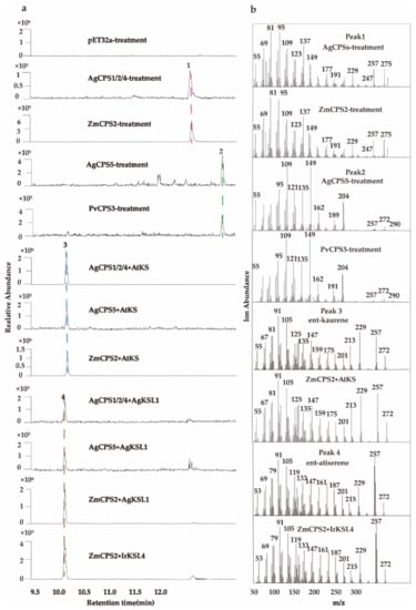 GC-MS analysis of AgCPSs and AgKSL1 reaction products obtained from in vitro assays. (a) 1~5: The product of AgCPS1/2/4/5 and ZmCPS2 (specific to ent-CPP) enzymatic reaction with GGPP, it is proved that the products of AgCPS1/2/4 and AgCPS 5 were CPP and 8,13-CPP; 6~8: The product of AgCPS1/2/4/5 and ZmCPS2 combined with AtKS (specific to ent-kaurene), it is proved that the products of AgCPS1/2/4 were the ent-configuration; 9~12: the product of AgCPS1/2/4/5 and ZmCPS2 combined with AgKSL1/IrKSL4 (specific to ent-atiserene), it is proved that the products of AgKSL1 was ent-atiserene. The enzymes ZmCPS2, PcTPS1, IrKSL4, and AtKS were used as controls. (b) Extracted ion chromatograms (EIC) of the product in different combinations above. Peak1: ent-CPP; Peak2: ent-8,13-CPP; Peak3: ent-kaurene; Peak4: ent-atiserene.